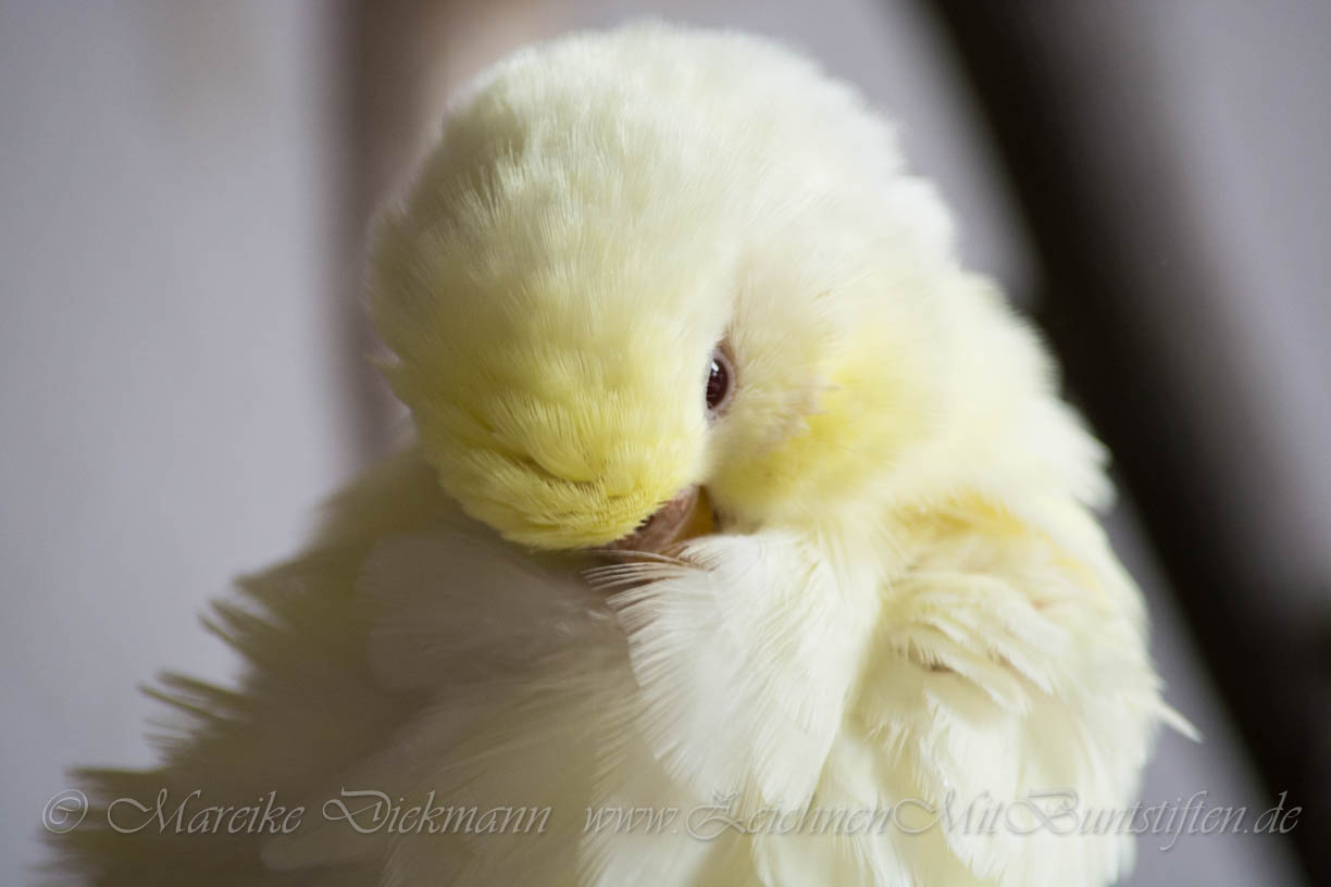 Dies ist eine Tierportraitzeichnung meiner Wellensittichhenne Susi. Sie ist hellgelb und seeehr schwer zu zeichnen, deswegen erstmal schwarz- weiß. Das Foto habe ich mal gemacht, als sie im März mit ihem damaligen Partner Leopold auf ihrem Vogelbaum saß und sich geputzt hat. Es war ein wunderschöner Anblick, da die Sonne gerade durch die halbtransparenten Vorhänge geschienen hat und ihr helles Federkleid erleuchtete. Es ist und bleibt mein absolutes Lieblingsfoto von ihr!